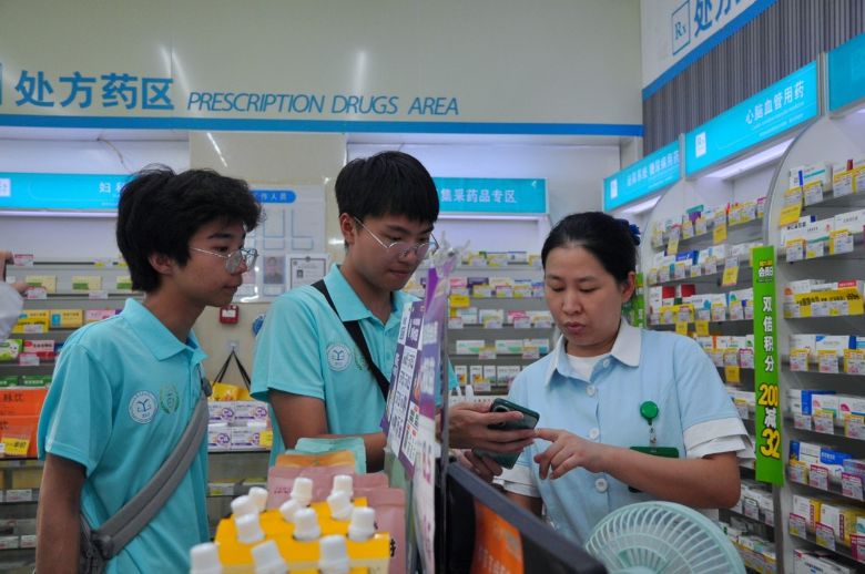 ▲图为实践队员在给药店工作人员宣传普通话 张阳摄