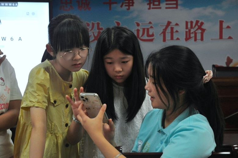接着,实践队员们帮助孩子们通过手机端普通话情况调查问卷,以图文结合的简单题型,让孩子们轻松完成填写。小小的屏幕上,每一个认真勾选的选项、每一次犹豫后写下的答案,都真实反映着他们对普通话的掌握程度。这一答题也为后续更精准地开展推广活动提供了鲜活依据,让这份童言里的“普通话印记”成为温暖的调研注脚。