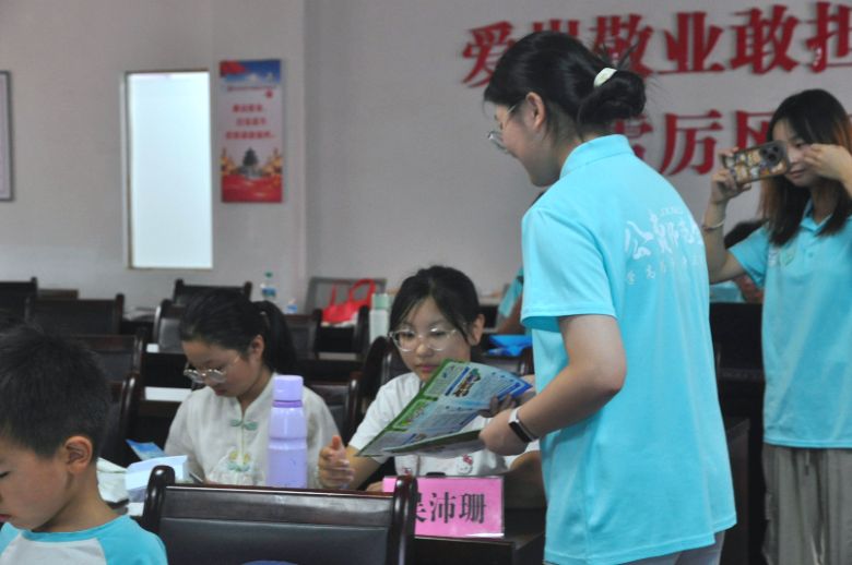 活动伊始,先有实践队员们分发宣传手册,让孩子们了解普通话的用处和重要意义。同时,给孩子们埋下兴趣种子,再以轻松互动的交流引导孩子们学说普通话,让规范表达在欢声笑语中自然渗透。