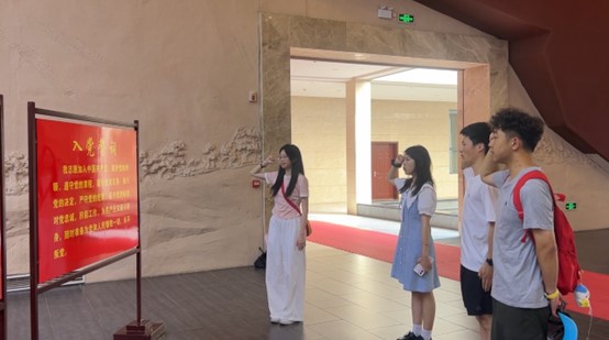 在参观活动的尾声,肃穆的氛围中,实践团全体成员整齐列队于纪念馆庄重的展厅。他们目光如炬,神情坚毅,共同凝视着那面鲜红如火的党旗。在党员刘迪嘉的带领下,成员们庄重地举起紧握的右拳,以饱满的热情和坚定的信念,重温入党誓词。“我志愿加入中国共产党……”那铿锵有力、掷地有声的誓言,在承载着厚重历史的展馆内久久回荡,仿佛与革命先辈们穿越时空的呐喊遥相呼应。这一刻,历史的回响激荡着青春的脉搏。