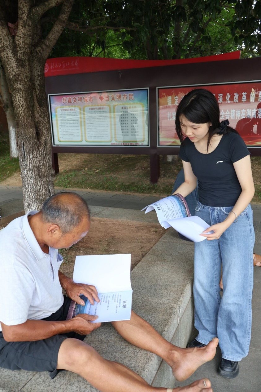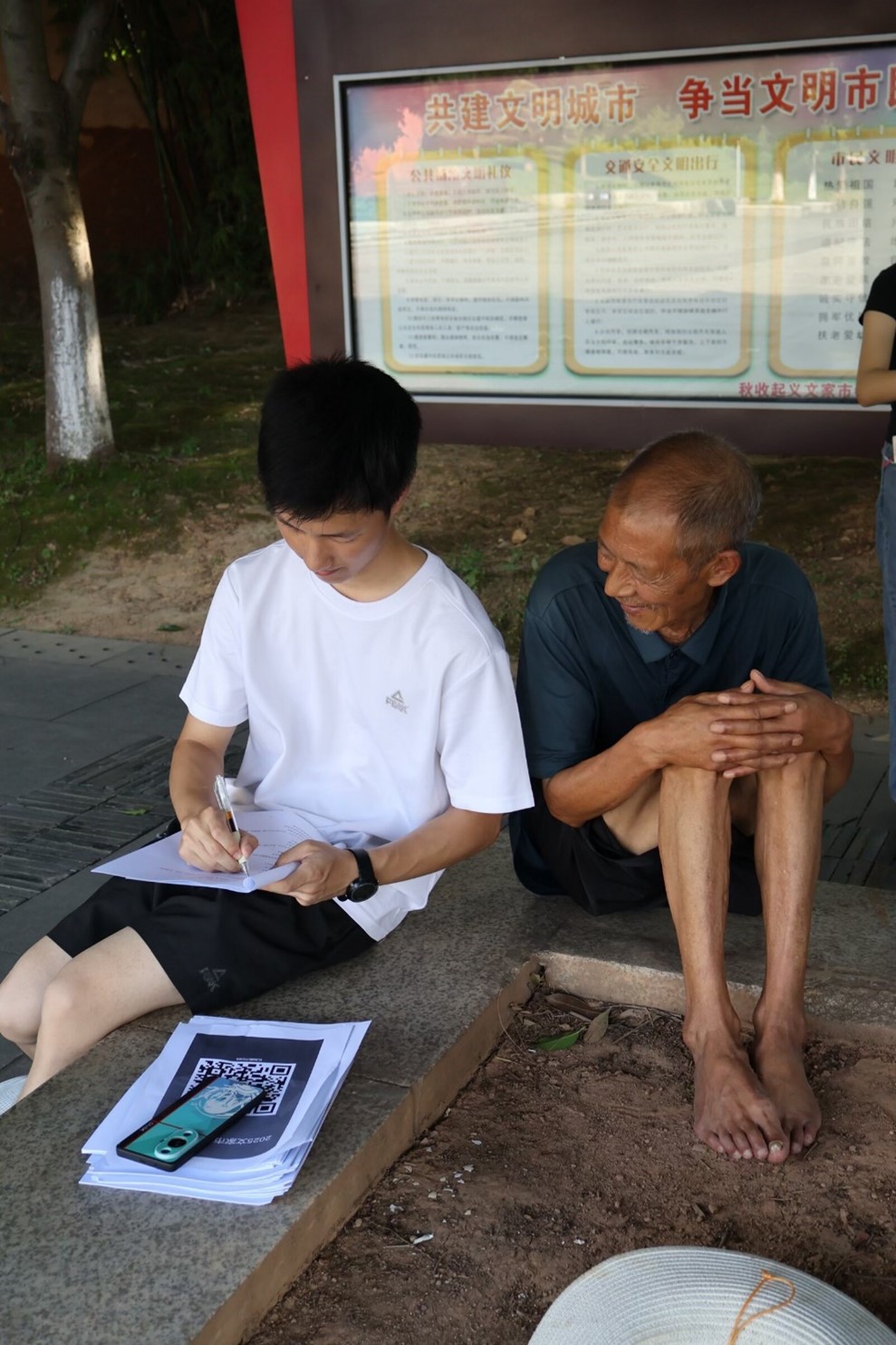 调研环节紧随其后。队员们深入走访,发放方言传承问卷。当面对年长或不识字的老人,他们便俯身贴近,耐心地将问卷内容逐一道来。“现在的年轻小伙小妹,有干劲!”队员们细致踏实的态度,赢得了文家市市民由衷的称赞和竖起的大拇指。