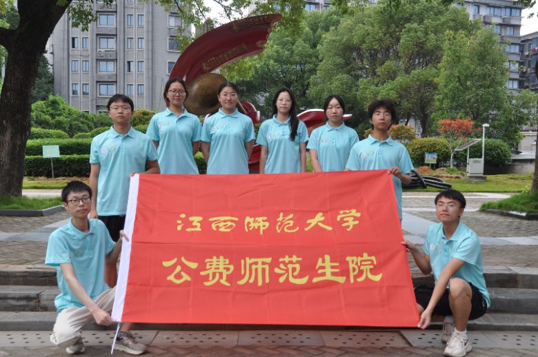 江西师范大学公费师范生院实践团队出发前,在江西师范大学公费师范生暑期社会实践活动相关场地前合影,即将开启“三下乡”实践行程。