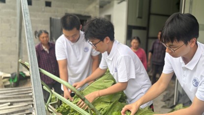 7月8日下午15点,团队成员来到箱子村附近的烟草工厂,刚下车便对该工厂的新机器进行探索,该机器的作用是通过将固体物料精确地加入反应釜中,以控制反应过程中的物料含量和比例。紧接着,团队成员帮助农民进行烟草的收纳整理,体验农耕劳作的艰辛与丰收的希望,感受“一粥一饭,当思来处不易”的深刻内涵。