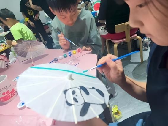 最让孩子们期待的,莫过于油布伞DIY体验环节。团队提前准备了半成品伞面、颜料和画笔,当材料包分发到手中时,孩子们立刻化身“小小设计师”,迫不及待地拿起画笔施展创意:有的画上独特气质的梅花,有的画上熊猫吃竹子的场景……原本素净的伞面,在孩子们的巧手下变成了一幅幅充满童趣的“伞面画”。