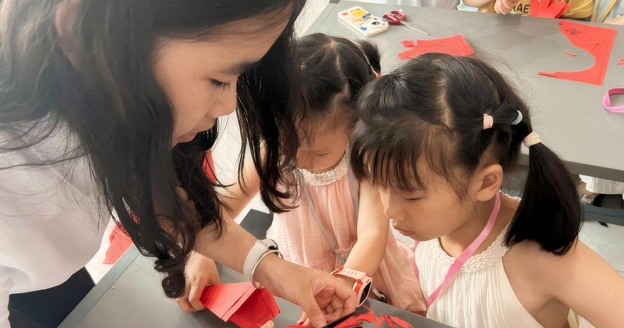 小小的红纸在指尖笨拙却认真地折叠、翻转,剪刀转动间小心地勾勒出充满童真的简单轮廓。实践团成员陪伴小朋友,耐心指导并保障安全。一件件充满童稚拙趣的剪纸作品,如同初春绽放的小花,无声地诉说着小朋友们对传统技艺最直接的感知与纯粹的爱。