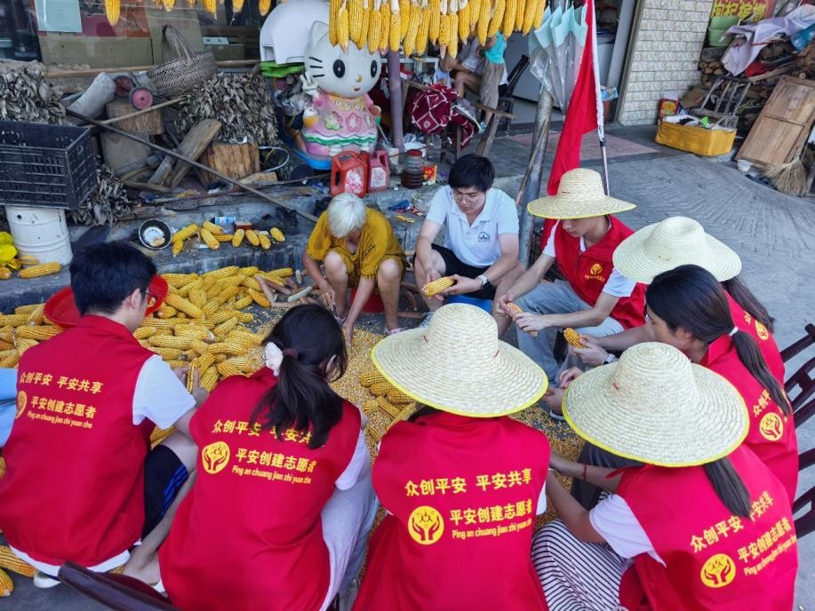 正值玉米收获季节,为了帮助村民解决劳动力不足的问题,志愿者们主动帮助村民剥玉米。大家不喊苦、不喊累,现场一片忙碌而又有秩序的景象。尽管烈日炎炎,汗水湿透了他们的衣衫,但志愿者们依然干劲十足。