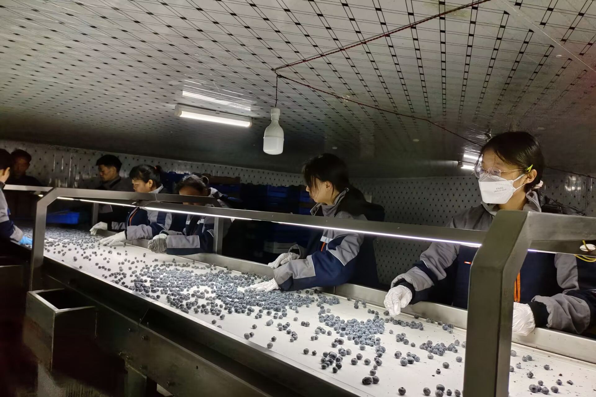 随着采摘的结束,蓝莓的后续处理工作紧锣密鼓展开。基地分拣车间采用“智能分选+人工质检”双轨模式,依托智能系统完成检测后,初采蓝莓鲜果及时进行冷冻锁鲜。分拣在低温情况下进行,成员们身穿反季服装,目光炯炯,保持同一姿势进行分拣。实践小队成员通过实操掌握了冻果品质分级标准,直观认知到农产品加工中“标准化流程对供应链效率的提升作用”。实践队成员汪洪英感慨道:“正是员工们严谨的工作态度和高标准的智能运输流程,让怀宁蓝莓能带着新鲜劲儿走进更多城市,成为响当当的名片。”