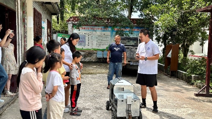 随后,偶尔含着小朋友们啜泣声的课堂被站在讲堂上的科普人员所打破——“大家想不想看看‘变形金刚’?”霎时,小朋友们的兴趣被勾引起来,大家你一言我一语的争论着。在实践团的带领下,小朋友们有序来到了村委大院中,一睹这驰骋于农田之上的“金刚。”