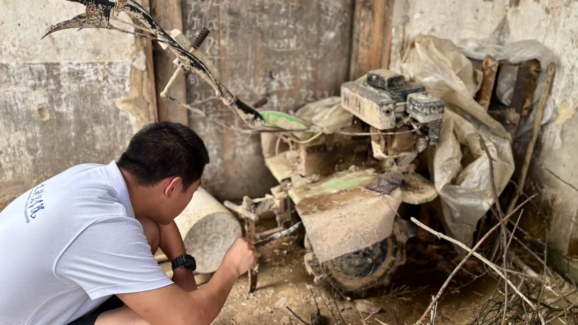 在展示非遗竹编文化的同时,实践团还带来了智能农机,并与当地传统农机进行对比。在一片空地上,摆放着锈迹斑斑、结构简单的传统农机,这类农机在操作上依赖人力驱动,效率较低且劳动强度大。与之形成鲜明对比的是实践团带来的智能农机,外观科技感十足,配备先进的自动化控制系统。