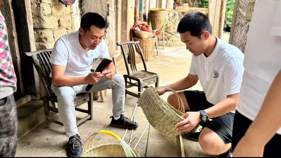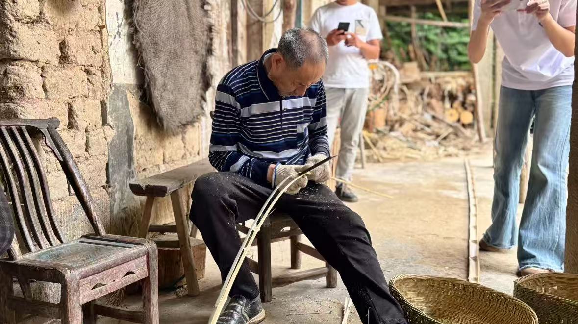 (图为村干部体验非遗竹编 彭俊博供图)
