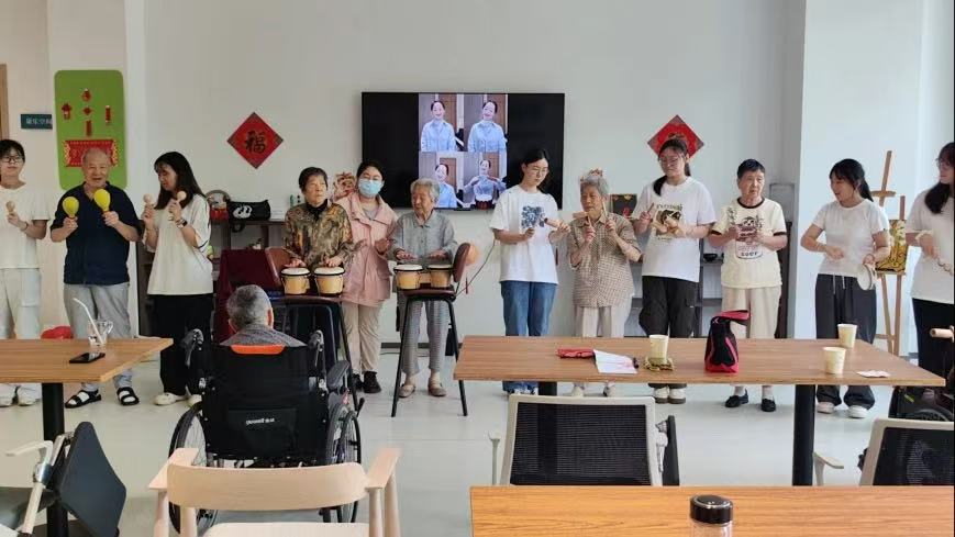 随后进入“银龄共奏”环节,实践团与长者围坐,借乐器开展节奏互动。从简单配合到完整旋律演绎,志愿者耐心指导,长者积极参与,活动室里的轻快节奏,成为代际情感交流桥梁,让养老中心温情满溢。