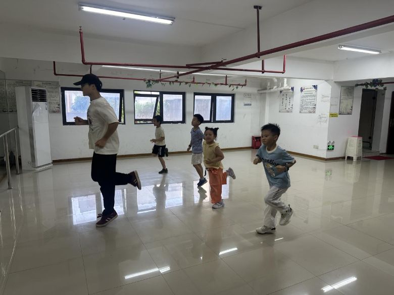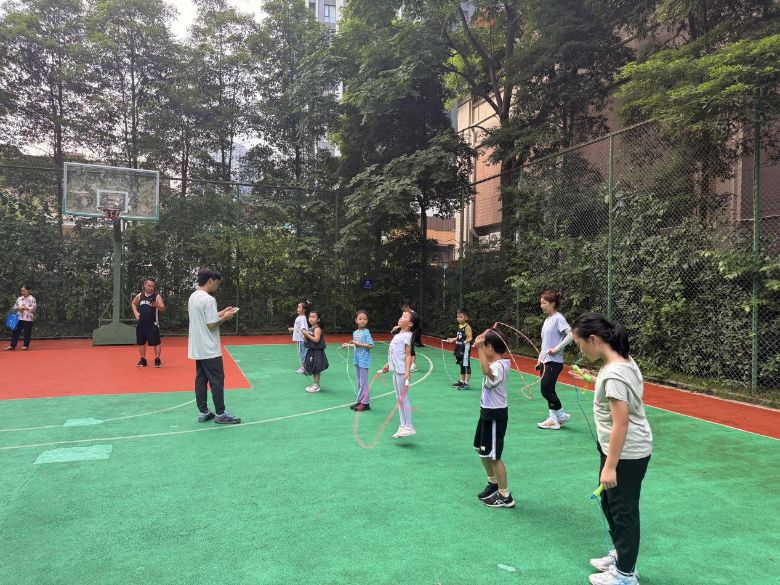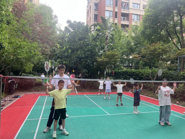 清晨的阳光洒满社区活动场,孩子们排着队,在志愿者带领下活动身体,为训练做准备。这片简单的场地,满是孩子们对运动的喜欢,也能看到体育教育在社区里慢慢开展。志愿者按进度教学:武术复习五步拳、学少年拳后半段,志愿者演示讲解;羽毛球练发球、挑放,志愿者指导增球感;乒乓球复习后学搓球、拉球,逐个纠正;篮球练拍球、传球,示范要领;跳绳练单摇、连续跳,一旁鼓劲;健美操学踢腿及相关动作,孩子们活力满满。