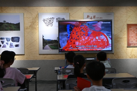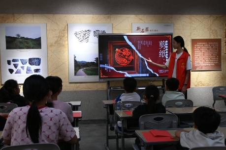 图为实践队队员吴老师为孩子们讲解中国剪纸 吴一虹摄