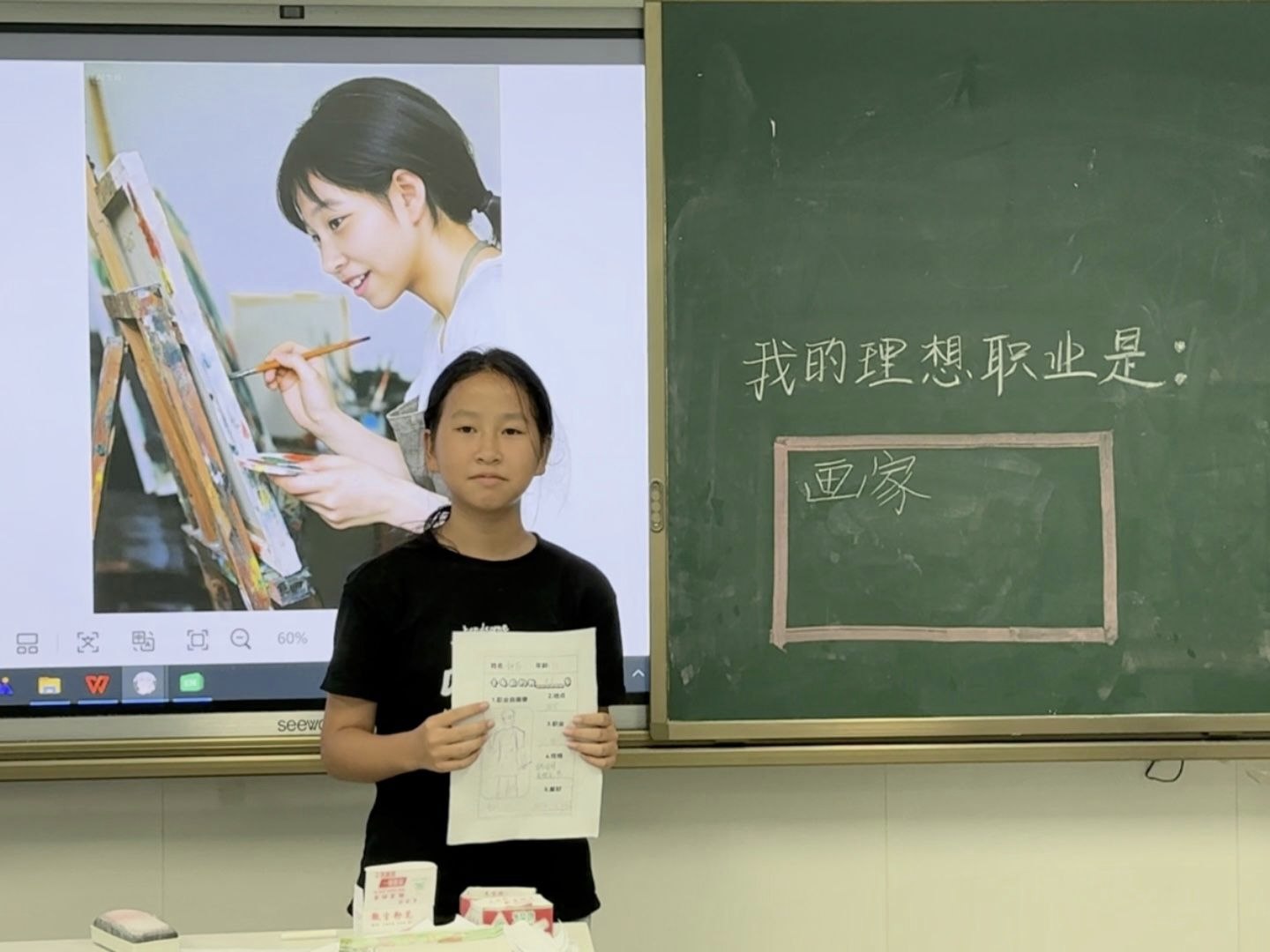 本次主题班会针对不同年级学生特点精心设计多种课程:借助AI技术,预见未来从事目标职业时的模样;开展模拟村官活动,初步了解乡村建设的工作内容;执笔绘画,勾勒心中理想的乡村样貌。各班会开展以寓教于乐的形式,为孩子们搭建职业规划与乡村振兴之间的桥梁。课堂互动中,经实践队队员的引导和启发,孩子们对未来就业方向有了初步构想。“我想当一名教师,以后可以回到赤溪教书!”高年级学生沈佳琪兴奋地说道。
