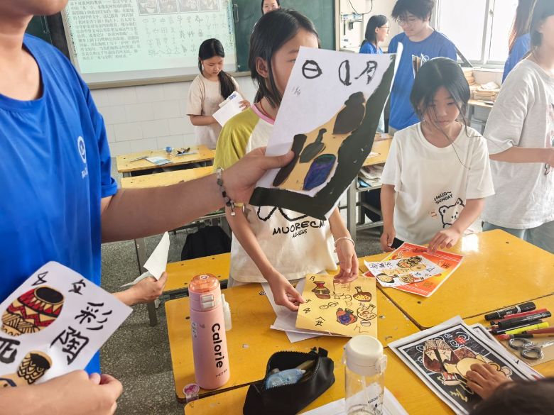 在实践体验环节,志愿者带领孩子们通过“水质净化小实验”,讲解黄河生态保护知识;通过剪贴牛皮纸制作陶罐,了解黄河文化中的彩陶文化。