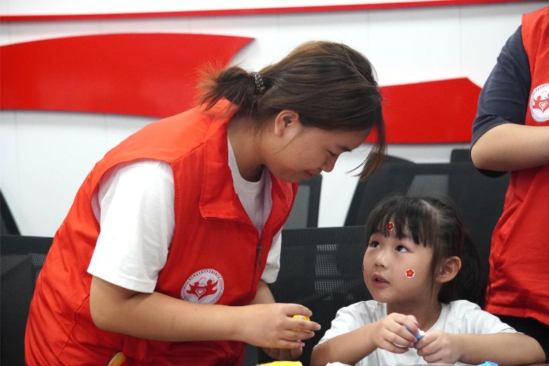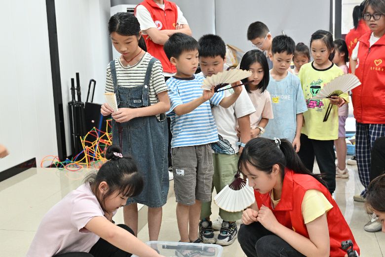巧手制漆扇,汇演展风采 当日下午,一队志愿者“一对一”指导社区儿童体验传统漆扇制作,感受非遗文化独特魅力。一队志愿者在“青年之家”布置汇演现场与课堂作品展。