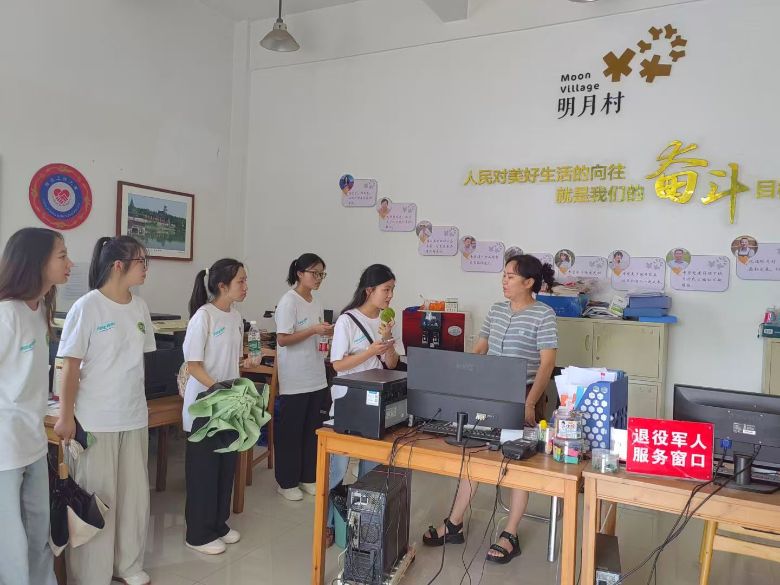 青芯康研社团队对当地的民宿、闲置房屋等进行了实地调研。在炎炎烈日下,团队成员来到了明月村村委会,在吴书记的带领下找到了曹女士。我们与曹女士进行探讨交流,她向我们详细介绍了明月村的发展情况以及未来发展方向,对当地的民宿以及闲置房屋率进行的概述。之后,团队成员进行走访调研,观察当地的房屋类型以及闲置情况,对当地的民宿经营模式以及房屋状况有了总体的了解。