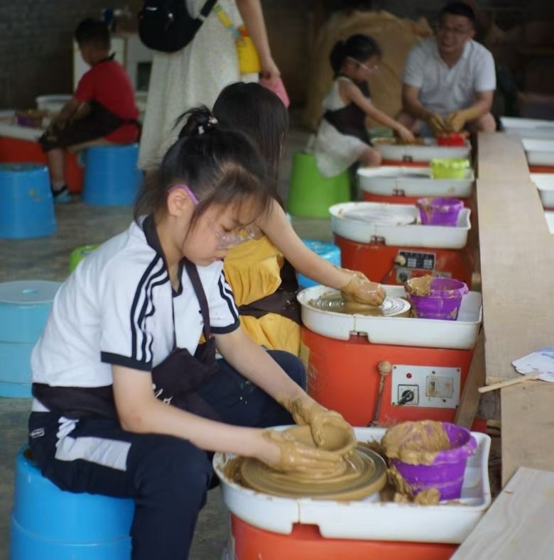 告别茶园,队员们走进陶艺工坊,见证匠心独运。泥土的芬芳瞬间萦绕鼻尖。大家化身“陶工”,坐在陶轮前,全神贯注地体验泥坯在手中旋转、塑形的神奇过程。小小的工坊里,欢声笑语与专注创作交织,每一次揉捏、每一次拉坯,都饱含着队员们对传统技艺的好奇与投入,尽情释放着创造力,感受着与土地相连的质朴情感。