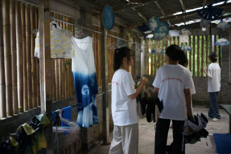 队员们邂逅了蓝染工坊的自然之美。洁白的布料在染缸中浸润,经过草木染的“魔法”,逐渐晕染出深邃而独特的蓝色图案。大家惊叹于这项古老技艺的神奇,近距离感受植物色彩与纹理如何在匠人手中完美融入布料,深切体会到传统手工艺的独特魅力和劳动人民的智慧结晶。