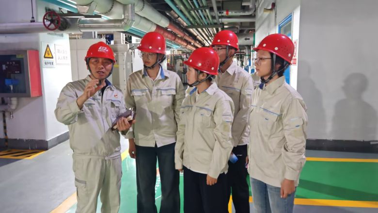 下午,团队来到田集电厂。通过与企业负责人的交流谈话,同学们了解到该电厂通过“煤电一体化”经营模式和超临界技术的应用,在保障能源安全的同时,实现了污染物排放浓度远低于国家标准的优异成绩。在结束谈话后,同学们跟随技术人员深入电厂内部,参观电厂燃烧发电机组设备和中央控制室,中控室电子屏幕上的一组组实时数据生动展现了技术创新带来的能效提升和减排成效。
