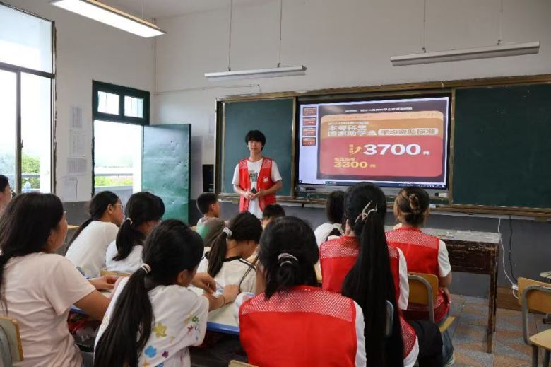 实践团成员为山枣中学学生们介绍资助政策。 邓佳豪摄