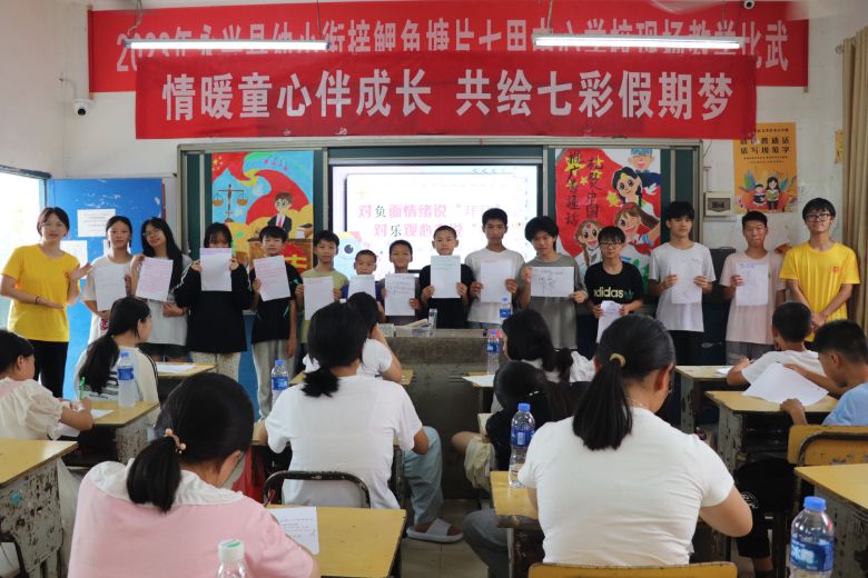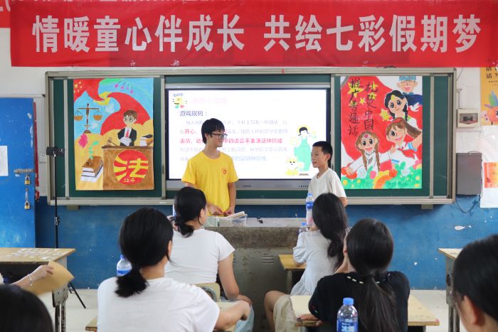 为全力守护留守儿童,用心用情呵护少年健康成长,7月10日,湖南工程学院计算科学与电子学院“星耀七甲 筑梦童行”关爱留守儿童志愿服务团队,为郴州市七甲乡的50名小朋友精心开展了一节主题为《对负面情绪说“拜拜”,对乐观心态说“嗨嗨”》的课程。志愿者们首先通过生动有趣的动画视频和贴近生活的现实案例,向小朋友们传授了认识情绪的基础知识。随后,他们运用互动问答、情景演绎、趣味游戏等寓教于乐的方式,教会孩子们有效的情绪管理技巧以及如何克服不良情绪,使每个孩子都能成为情绪的主人,敞开心扉,编织出灿烂的人生篇章。
