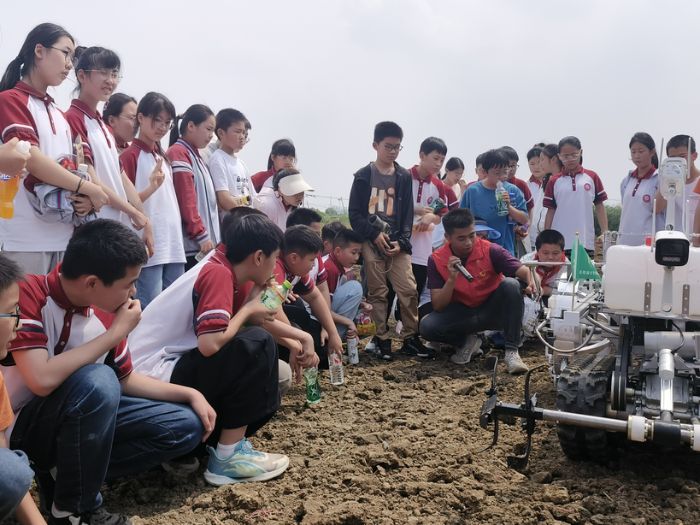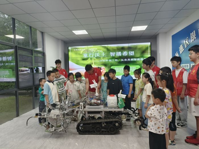 实践团队师生带着自主研发的播种机走进耘泰慧谷农乐园、银西社区等多地,面向小学生开展“小小农机师”科普活动。队员们将复杂的农机原理转化为趣味实验,让孩子们在游戏中理解智慧农业。这些带着泥土清香的科普课,这种沉浸式的科技启蒙,既传承了农耕文化,又点燃了青少年探索科学的热忱,正孕育着乡村振兴的新希望。
