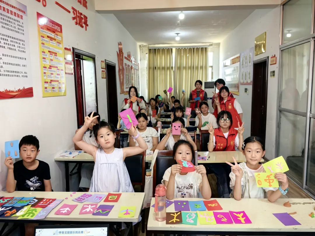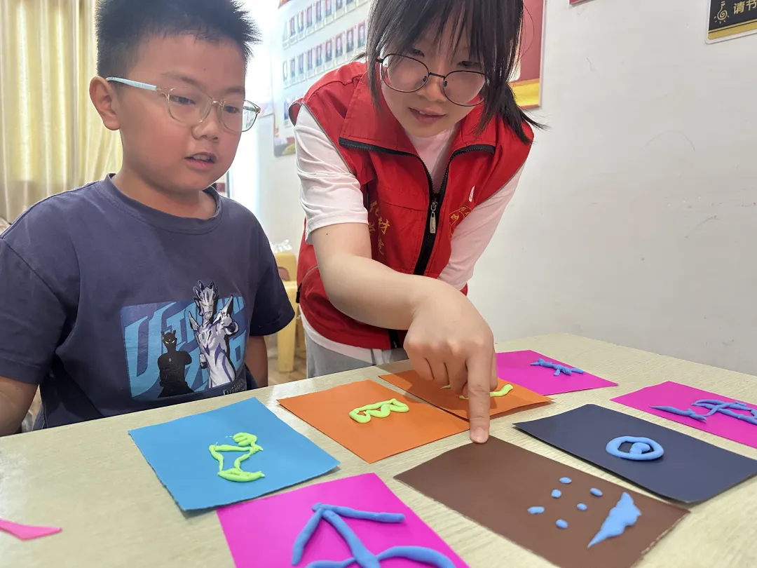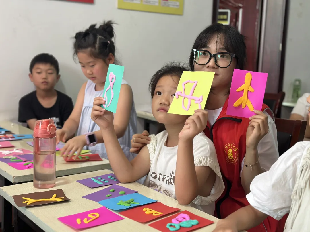 7月4日,实践团队开展“文化传承”主题活动,以丰富形式助力乡村儿童感受文化魅力。上午,团队成员围绕“汉字寻踪,字旅流芳”主题,从甲骨文起源讲起,组织孩子们用黏土捏制“日”“牛”等象形文字。孩子们在动手过程中,直观理解了汉字从图画到符号的演变。下午,活动以“疏河筑埭守安澜”为主题,志愿者通过图文和视频,讲述王家坝抗洪史中“舍小家为大家”的治水故事,加深了孩子们对王家坝精神的认同。此次活动以“文字符号+地域故事”双线设计,让儿童既触摸到汉字文化的厚重底蕴,又理解了治水精神的时代价值,有效激发了孩子们的文化自信与乡土情怀,推动传统文化在乡村儿童心中扎根。