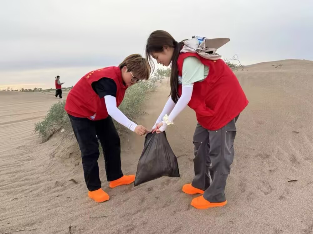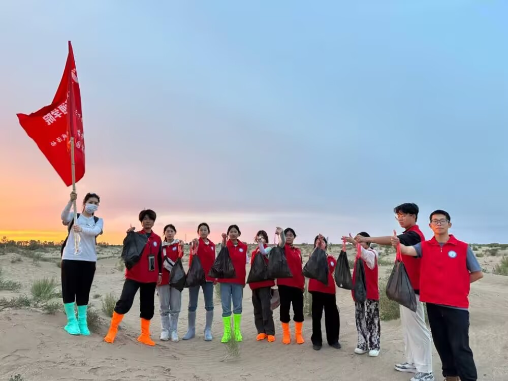 沙海“净旅”,于热沙中为自然抚平“伤痕”烈日似熔金,肆意倾洒,将黄沙烤得升腾起袅袅热烟。滚烫的风裹挟着层层热浪,如猛兽般扑打在脸上,连影子都被这酷热逼得蜷缩进沙粒缝隙。沙地上,那些被风卷来、遭人丢弃的软塑料垃圾,在烈日暴晒下格外扎眼,宛如大漠肌肤上一道道狰狞“伤疤”。它们破坏着和谐壮美的生态,更如隐匿杀手,威胁着沙漠动植物——缠绕的软塑似冰冷枷锁困住沙蜥,轻薄塑料膜如厚重阴霾遮蔽沙生植物阳光。实践团成员俯身于沙海,弯腰捡拾的动作不断重复,数百上千次。细沙钻进衣领,如细针磨出红疹,刺痛难耐;汗水如溪流顺着脸颊流淌,在下巴汇聚成小溪,滴落滚烫沙地瞬间消失。可无人抱怨,他们眼神坚定执着。从花花绿绿的食品包装袋到破碎农膜,每件软塑垃圾都被小心分类收纳,视若珍宝。在一次次弯腰与捡拾中,他们领悟:清理沙漠垃圾,不只是简单的行动,更是一场迟来的深情道歉——为人类对自然的轻率莽撞,为文明进程中的疏忽过错。当最后一片垃圾被清理,沙漠重现原始质朴肌理,如明镜映照出人类与环境相处的永恒命题,警示我们敬畏自然、守护家园。