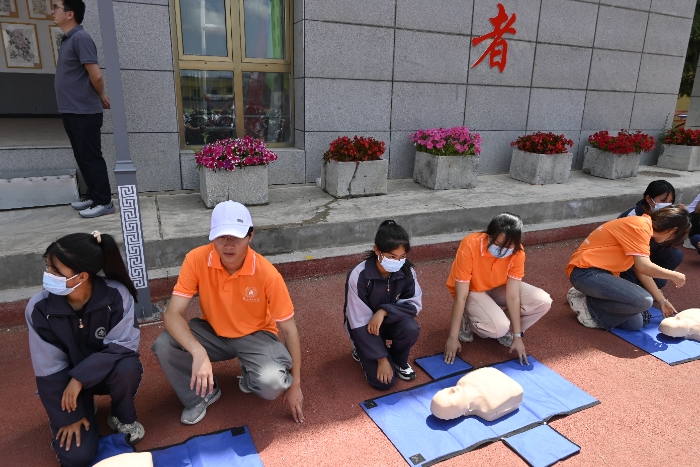 在东乡民族中学,实践队邀请甘肃省红十字会开展专题宣讲。甘肃省红十字会郭爱军老师通过情景模拟、互动问答和实践操作等方式,向400余名师生普及心肺复苏、海姆立克急救法、创伤包扎等实用技能。初二学生马路遥在实操环节中,在队员指导下完成胸外按压模拟,他感慨:“以前觉得急救离我们很远,现在知道关键时刻能救人一命!”