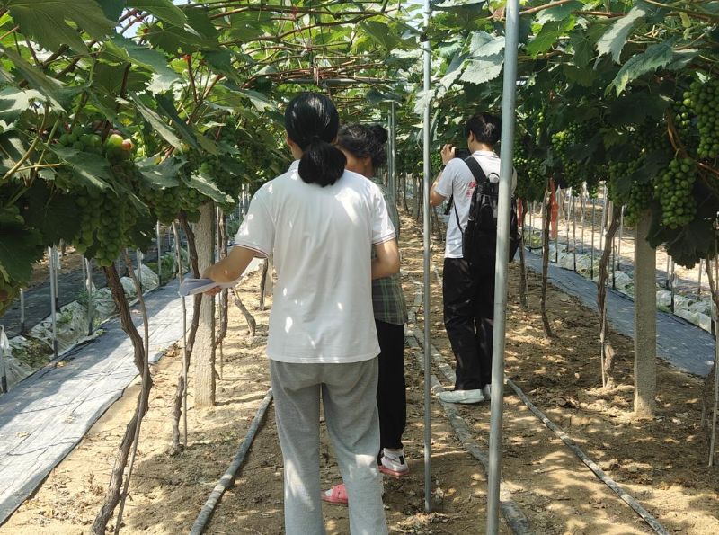 为积极响应和落实政府出台的“加快发展智慧农业”的文件,进一步了解农业生产效率、农产品的质量,2025年7月3日,巢湖学院赴同大镇及王家坝“智汇农业,数联乡村”智慧农业发展调研团成员在安徽省合肥市庐江县同大镇马河村葡萄观光长廊参观调研。抵达目的地后,调研团成员们被眼前这片生机勃勃的景象深深吸引。葡萄观光长廊如一条翠绿的绸带,蜿蜒伸展在广袤的田野之上,不仅为大地披上了绚烂的夏装,更以其独特的魅力吸引着四面八方的游客前来观光体验。长廊下,一串串晶莹剔透的葡萄挂满枝头,仿佛是大自然精心布置的珠宝,散发着诱人的光泽和香气,预示着又一个丰收年的到来。