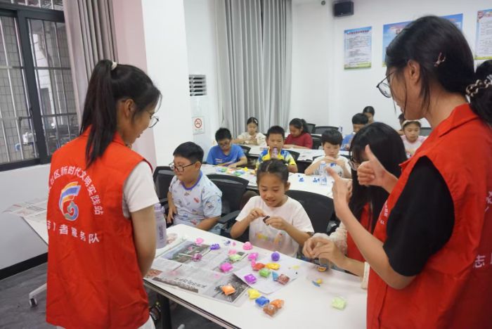 二、崇文社区:粘土巧塑性,小手创童趣 崇文社区的活动同样热闹非凡,17名小朋友兴致勃勃地投入到超轻粘土制作活动中。在队员的示范下,孩子们揉、捏、搓、粘,将五颜六色的粘土变成了可爱的小动物、蔬菜等各种造型,体验着手工创作的乐趣。
