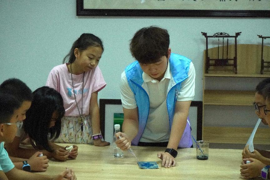 图为实践团成员进行蓝晒实验演示萧佳欣摄