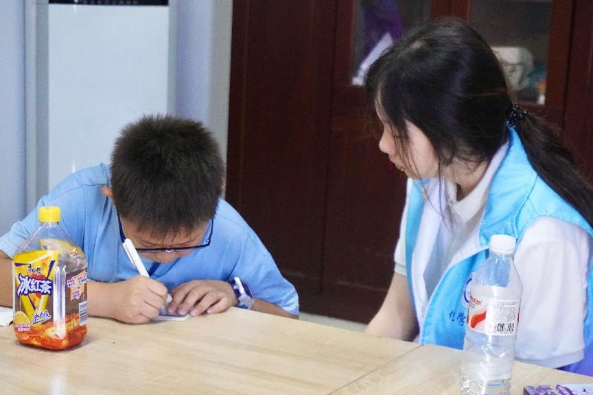 图为实践团成员辅导小朋友做作业吴思逸摄