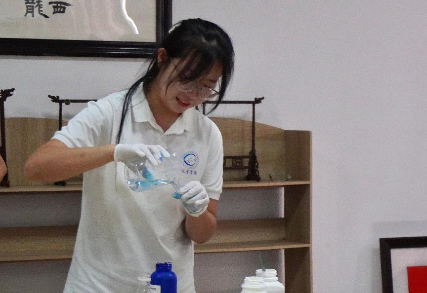 图为实践团成员进行亚甲基蓝氧化还原实验演示吴思逸摄