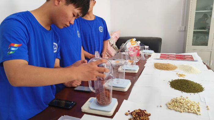 7月5日,生命科学与工程学院“青耘良西-青春兴农实践团”在驻地开展产品转化实践。基于7月4日初步确定并经过试喝的“五色养心粥”营养配方及比例,团队成员进行了原料采购,并按标准配置、封装了三斤装与五斤装两种规格的产品。