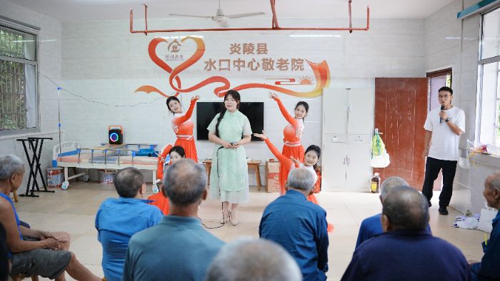 炎陵水口镇敬老院里,青春与银发共舞。文创组教老人用扭扭棒编出“向阳花”“如意结”,齐耳短发奶奶高举作品:“这朵花,我要别在胸口!”“艺青年”李响唱起《我的祖国》,曾为军人的爷爷指尖微颤,泪光中映着烽火岁月。《灯火里的中国》旋律悠扬,老人合掌轻和。民族舞热情奔放,中国舞衣袂翩跹,爷爷奶奶们随节拍拍手,掌声与笑声撞了满怀。文旅组架起“天安门”背景布,为老人拍摄“圆梦照”,并将活动过程制成纪念视频《青春暖夕阳》。