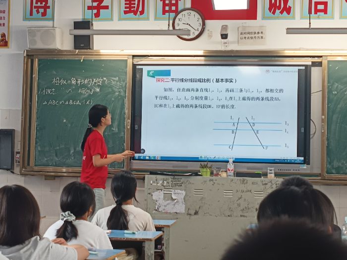 2025年7月12日,在湖南古丈县民族中学的数学课堂上,湖南第一师范学院“数映红途”乡村振兴促进团成员邹烨以《相似三角形的判定(1)》为课题,通过四重逻辑进阶,为乡村学生打通几何证明的核心脉络。