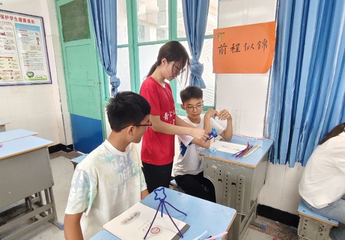 2025年7月14日,在湖南古丈县民中的教室里,一根根毛茸茸的扭扭棒正在学生手中幻化成眼镜、扇子与花环。湖南第一师范学院“数映红途”乡村振兴促进团成员夏坤荣的《扭扭棒创意工坊》课上,没有公式与习题,只有彩色绒线在指尖飞舞——这场看似简单的手工课,实则是融合几何思维、文化传承与情感教育的创新实验。