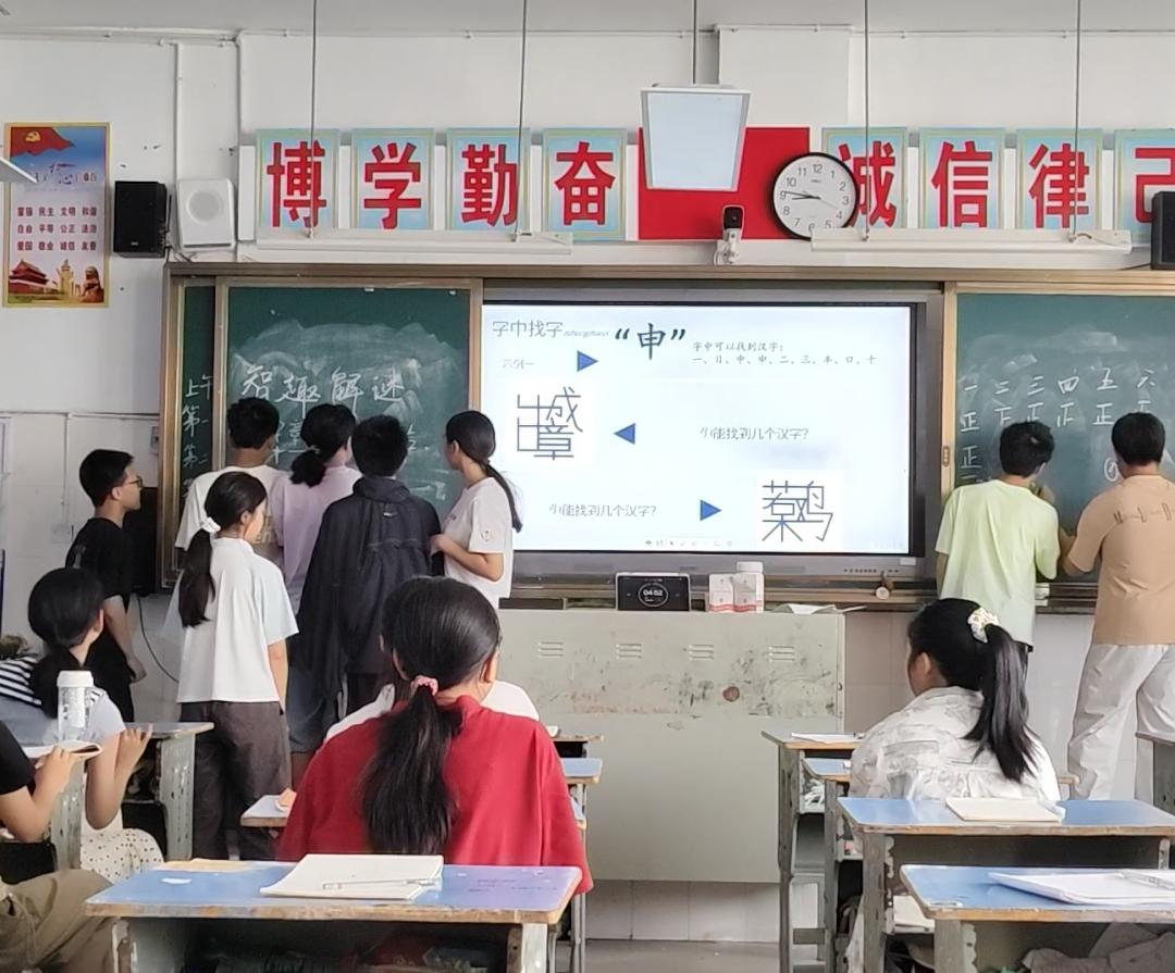 在“字中找字”环节,邓婕老师以“申”字为例,引导孩子们找出其中隐藏的汉字。随后对班级同学进行分组,小组成员找出隐藏汉字越多,获胜的概率越大,这提高了同学们团队合作能力。