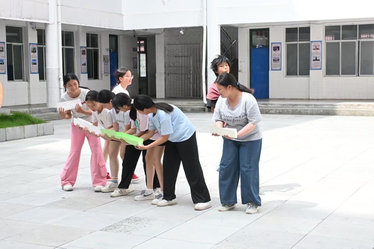 首轮比赛是乒乓球接龙。学生们分成四组,手持球拍小心翼翼地托球前进。“慢点!别急!”队友们在一旁紧张地提醒。尽管有几位同学因紧张导致球落地,但大家毫不气馁,互相鼓励,最终第二组以零失误的成绩夺冠。