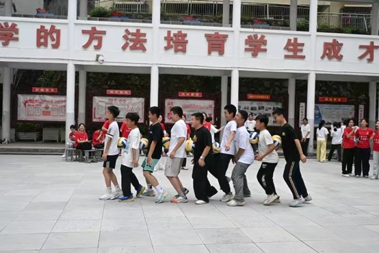 “预备——开始!”随着哨声响起,九名学生立刻化身“连体小火车”,他们侧身夹着排球,喊着整齐的“左右左”口号。排球像被施了魔法般稳稳卡在队伍中,阳光下跃动的身影构成了一道青春风景线。突然第三组的排球开始摇晃,“稳住!”队长急中生智放慢脚步,全队跟着调整节奏,最终逆袭夺冠。