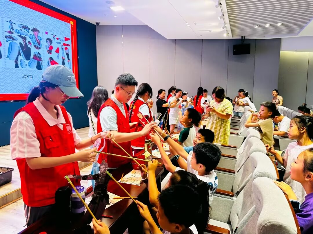 在制作技艺体验环节,团队成员们化身“助教”,将吴渊揭秘的选纸、绘图、剪裁、上色等步骤拆解为更易操作的小环节。建筑设计专业的小柯发现纸影剪裁的线条比例与建筑图纸设计有共通之处,便用卷尺测量示范作品的尺寸比例,手把手教小朋友们把握剪裁力度。“当看到小朋友们剪出的第一个纸影轮廓时,突然明白传承不只是技艺的传递,更是热情的点燃。” 小柯这样说道。团队成员还特意准备了不同颜色的环保颜料,在吴渊指导下,引导孩子们为自己制作的纸影上色,原本素净的纸片在孩子们的巧手下,绽放出充满童趣的色彩。