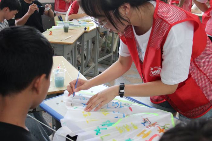 图为志愿者协助山枣中学学生绘制风筝。 王思璐摄