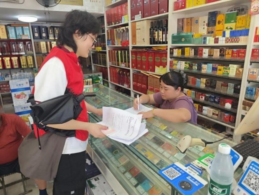 图为花园社区内,队员向临街商户发放宣传材料,帮助商户区分正规献血渠道与违规采血行为。阮梦婷摄