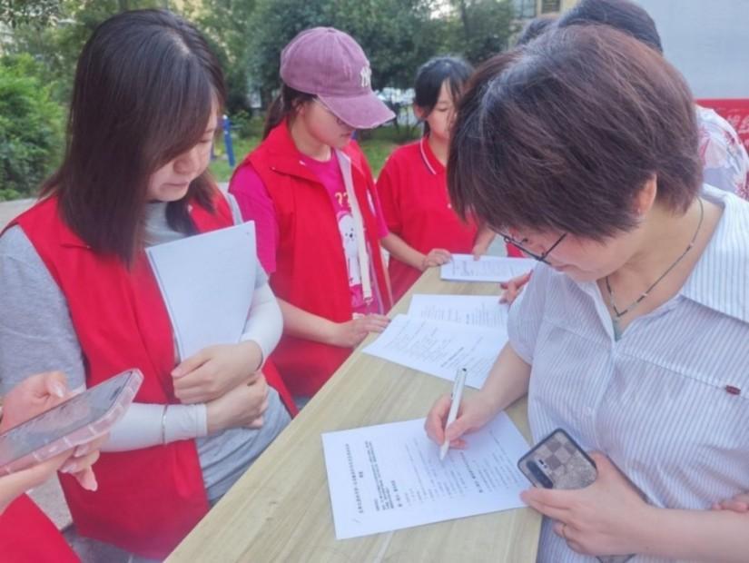 图为团队成员在卧牛山街道北大街社区向过往居民发放献血知识问卷,以收集居民对无偿献血的认知情况。张翔宇摄