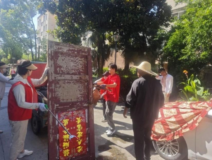 图为团队成员走进花园社区中,帮助老人清理楼道内堆积的废旧纸箱与杂物,改善社区居住环境。张翔宇摄