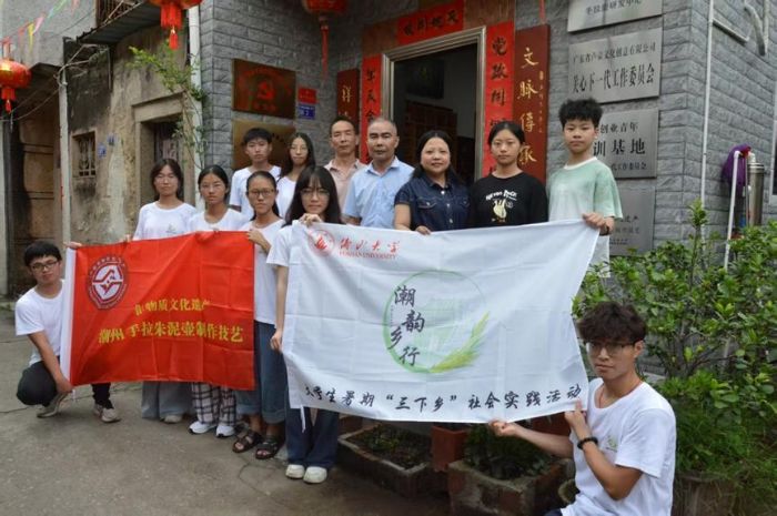 图为卢文祥大师、陈晓磊主任和潮韵乡行实践团成员合照姚俊凯摄