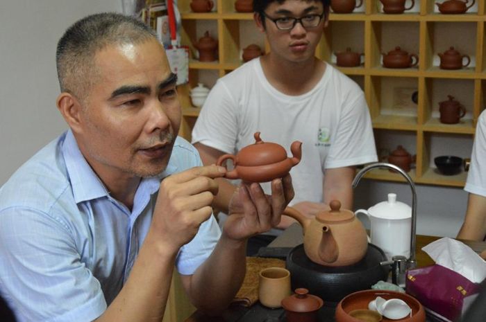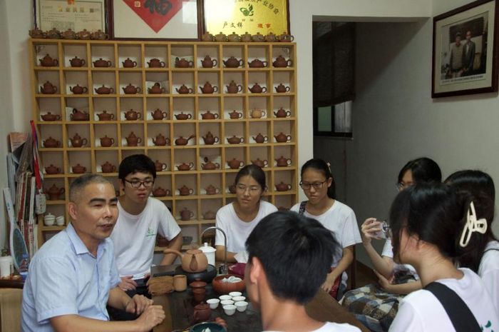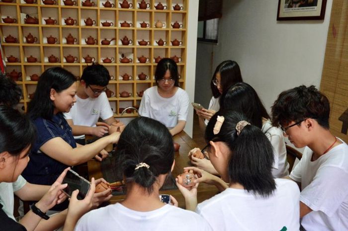 图为卢文祥大师向潮韵乡行实践团成员介绍长寿壶 姚俊凯摄