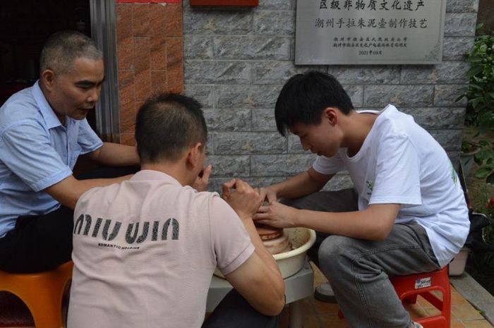 图为卢文祥大师带领潮韵乡行实践团成员亲手体验手拉壶制作姚俊凯摄